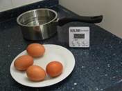 · Zoveel eieren als je nodig hebt · Een pannetje waar je eieren in gaat koken met daarin koud water uit de kraan. · Als je wilt en die hebt een eierprikker · Een keukenwekker · Eierdopjes · Eierlepeltjes · Zout · Een bord · Een onderzetter