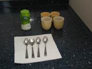 Zet elk ei in een eierdopje als je zo de tafel wilt dekken. Zet dan ook het zout en de eierlepeltjes op de tafel.