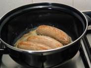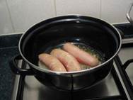 · Doe de saucijsjes met de vork in de pan. Laat elke kant van het saucijsje een beetje bruin worden.